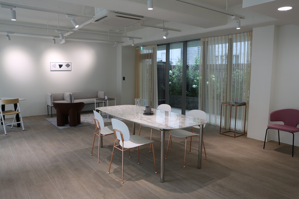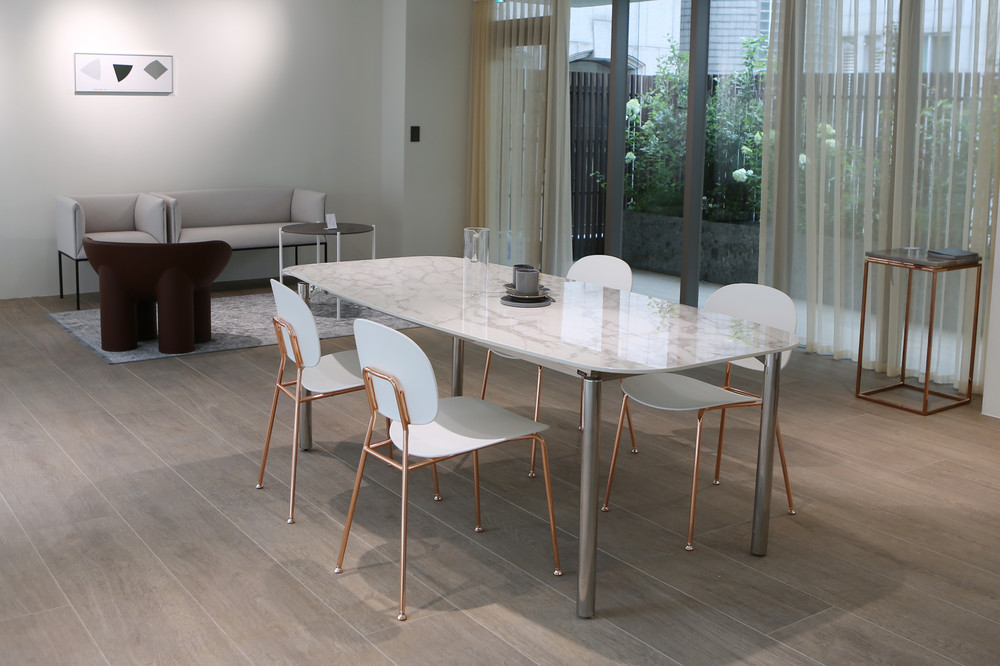 말끔한 원통형 다리에 테이블탑과 살짝 띄워진 프레임디자인이 특별하고 모던한 플로팅 다이닝테이블입니다 :)