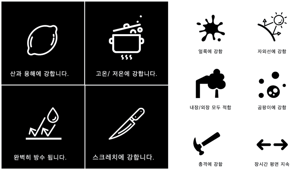 내구상이 좋아 벽, 바닥, 욕실, 주방, 가구, 외장 등 장소에 제한없이 적용이 가능합니다.