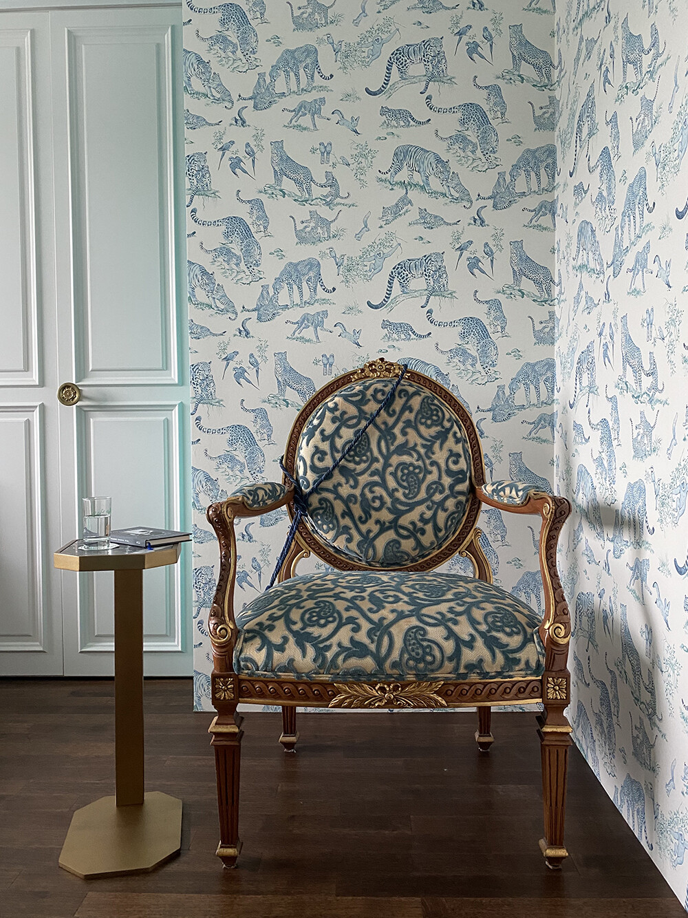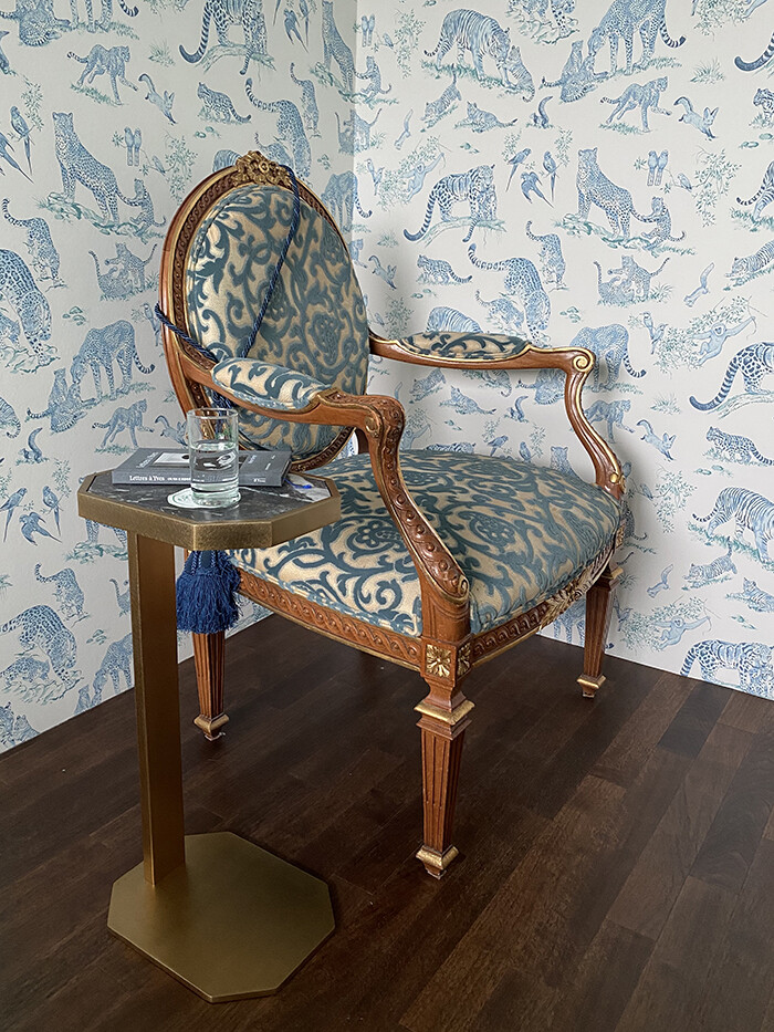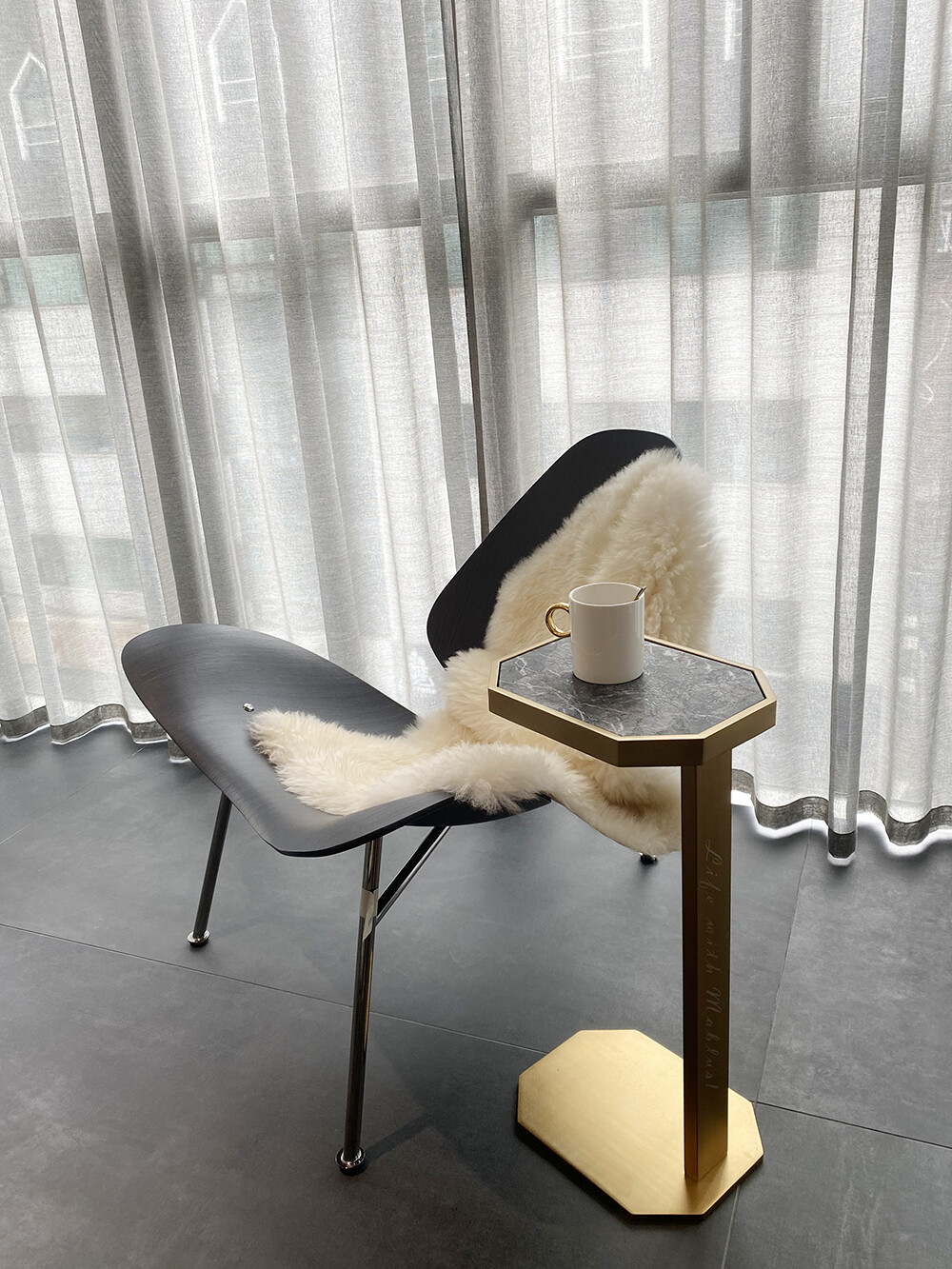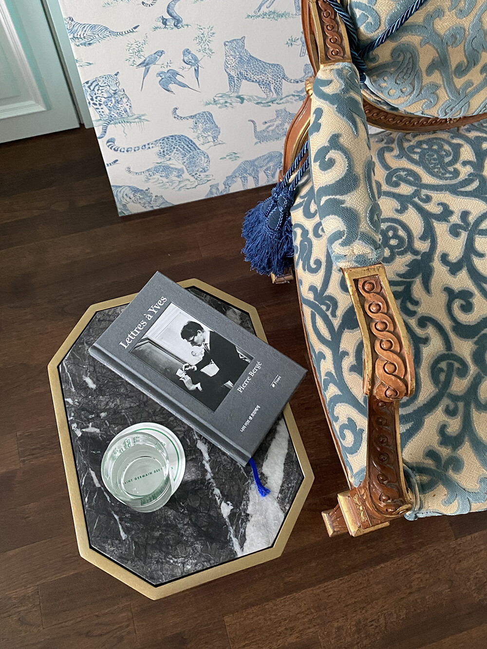 마티니 테이블의 상판은 아르데코 느낌의 팔각형 방돔 광장 쉐잎으로 만들어져있고